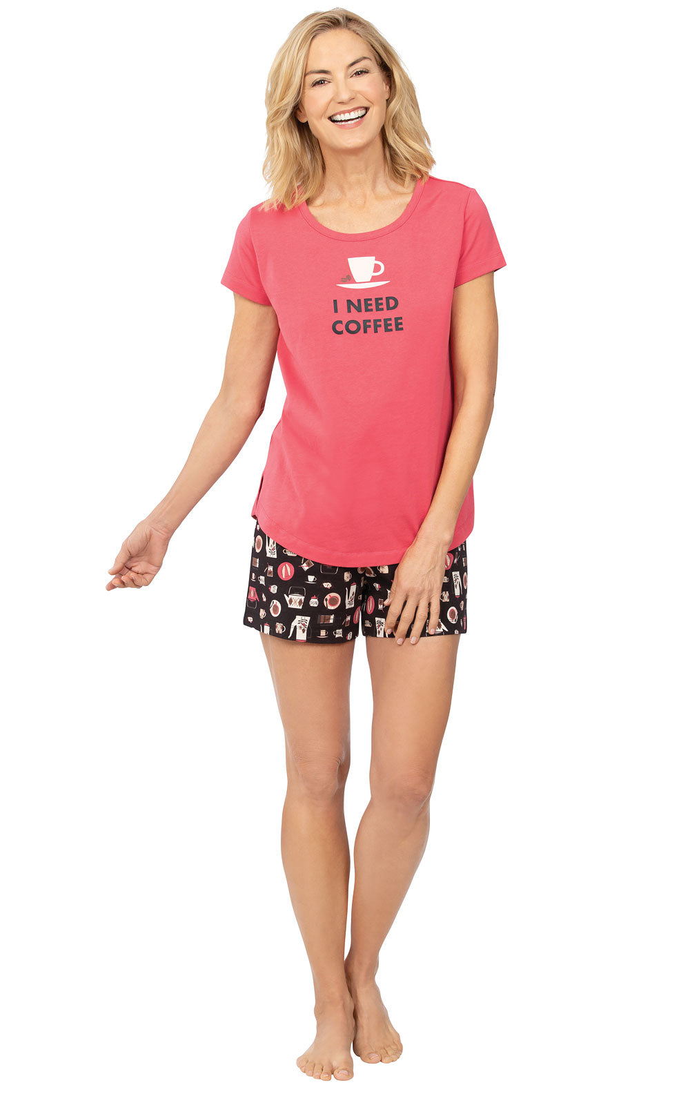 The soft cotton jersey Coffee Lovers Short Set is great for anyone who needs a little pick me up morning. noon or night. A flattering red top has a cup with saucer and reads I Need Coffee. The shorts have an allover print complete with everything from cream to kettles and an adjustable drawstring waist for a custom fit. Now. less talkie. more coffee.