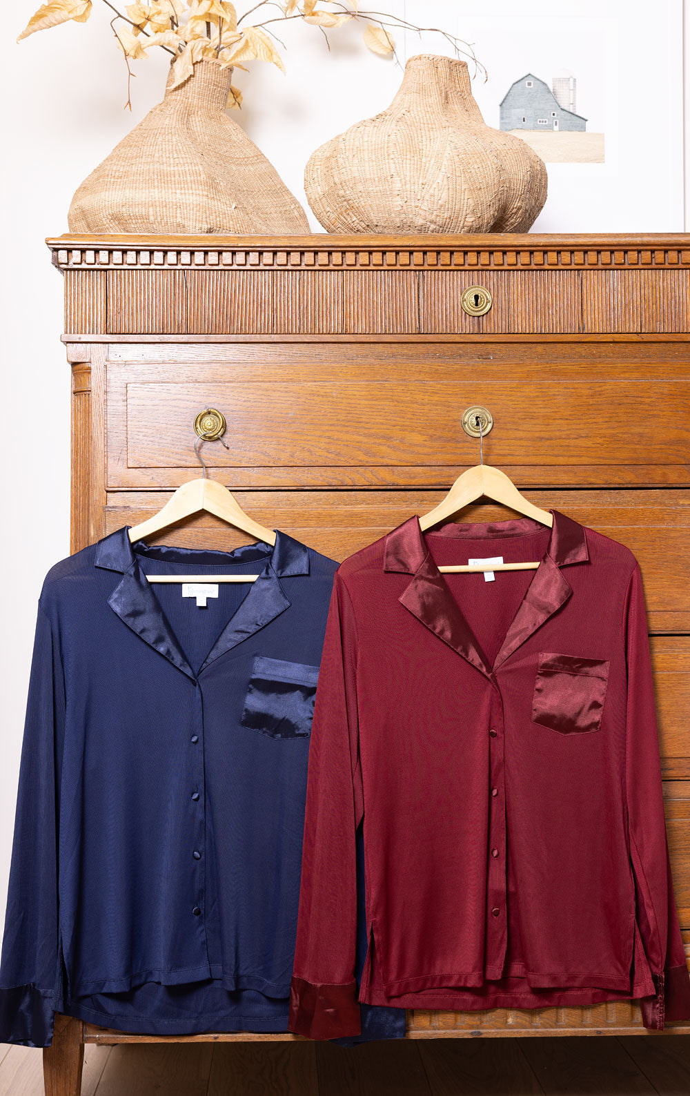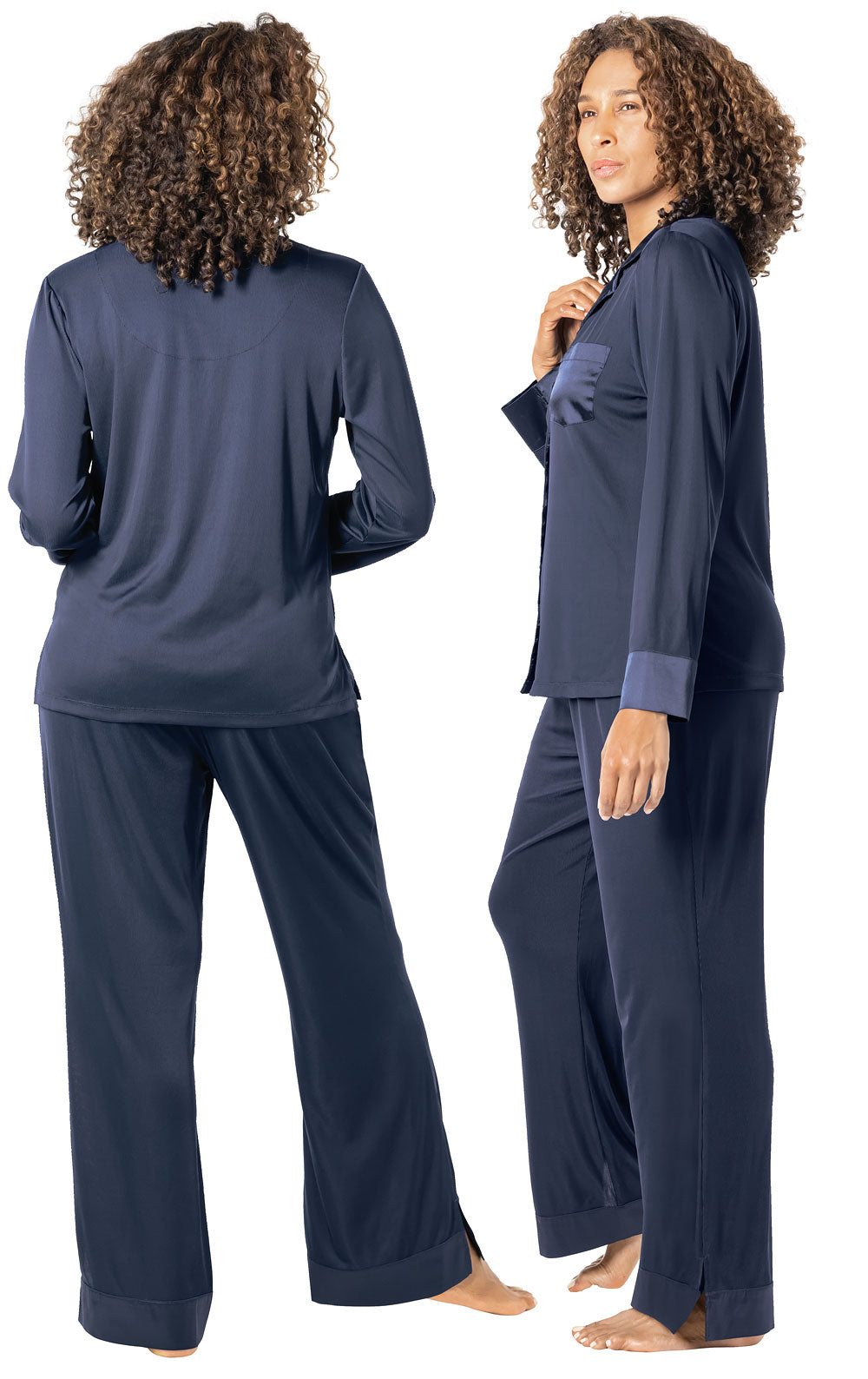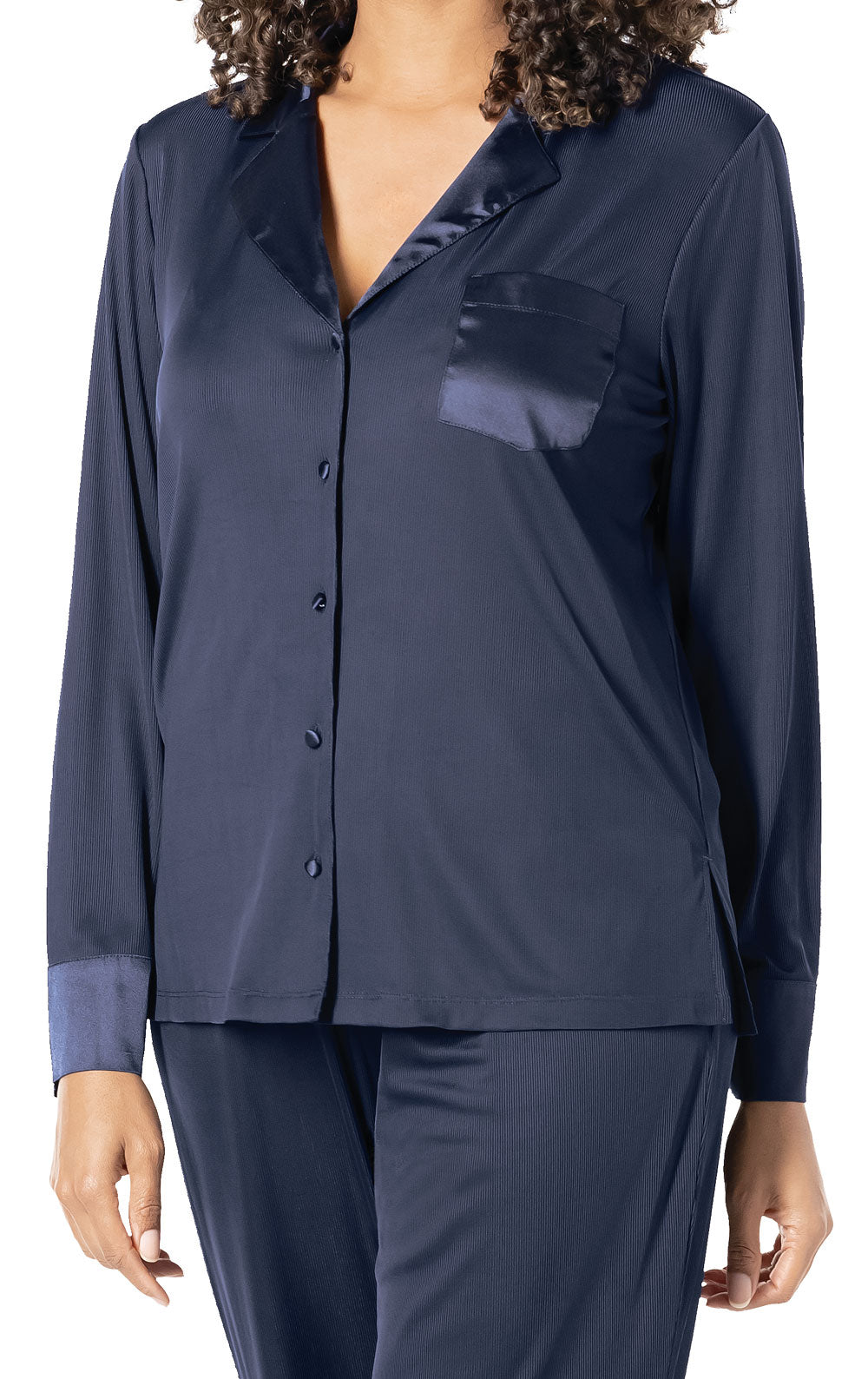 Looking for sleepwear that inspires endless hours of relaxation? What luck. the Luxe Satin Button-Front Pajamas are it. Made of a shiny knit. 2X2 ribbed material. this two-piece set is magnificently designed to move and stretch with the body. Featuring a long-sleeve top paired with relaxed fit. full-length bottoms. these pajamas get even better with smooth satin on the notched collar. lapel. breast pocket. cuffs. and drawstring. Say yes to staying in bed all day. slip into this set.